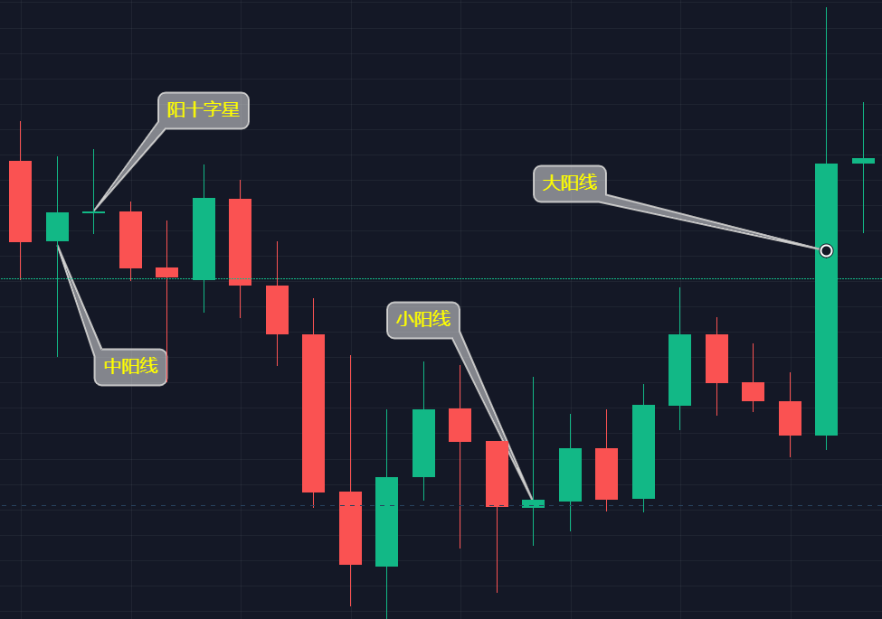 开盘价和收盘价差不多,上下影线比较长。这说明多空双方打平了,谁也干不过谁。十字星经常出现在行情反转之前——大涨之后出现十字星,可能要跌了;大跌之后出现十字星,可能要涨了。