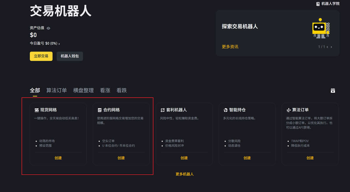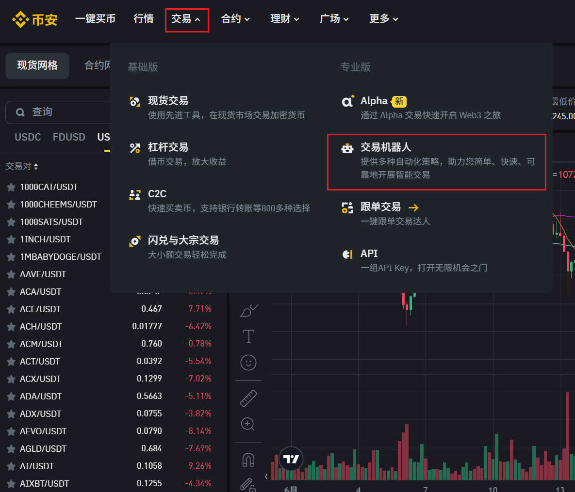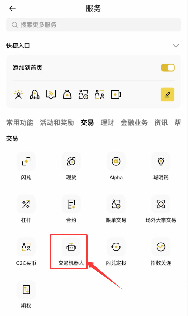 1. 登录币安账户,点击底部菜单的【交易】,随后进入【交易机器人】。