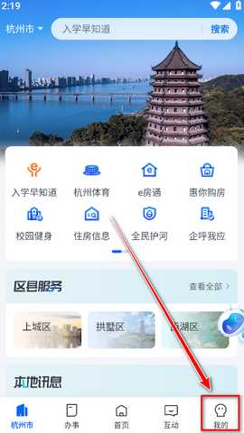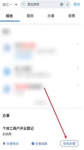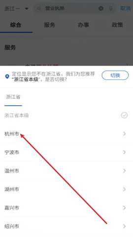 打开浙里办APP,选定自己所在区域,在搜索框可以直接进行业务搜索。