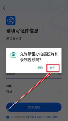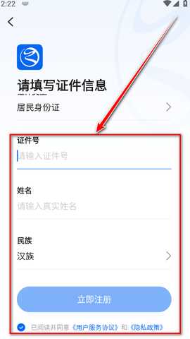 4.先输入自己的证件号和真实姓名,然后勾选已阅读并同意《用户服务协议》和《隐私政策》,最后点击立即注册。