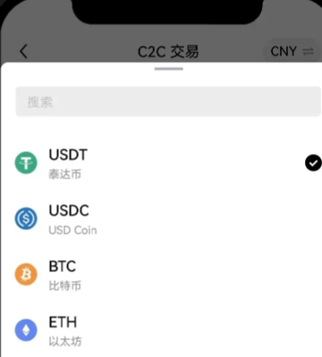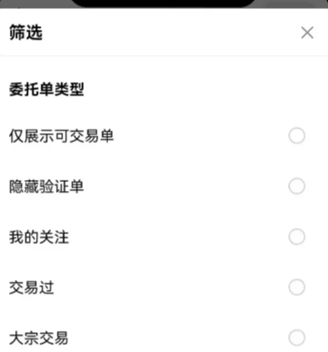 在购买页面,点击【USDT】可以搜索数字资产,点击【筛选】可以选择委托单类型和支付方式。