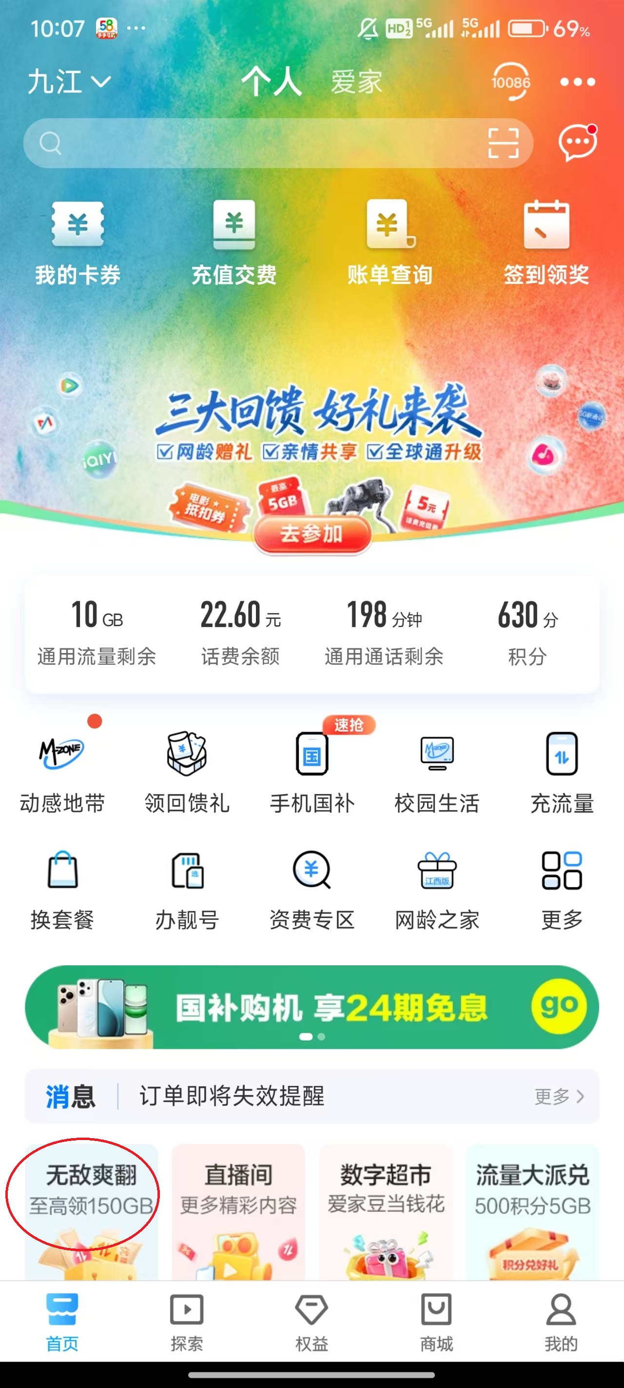 点击下方列表中的“无敌爽翻至高领150GB流量”。