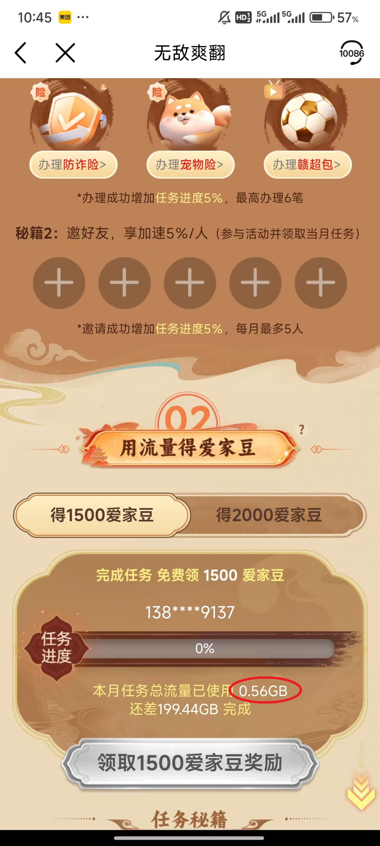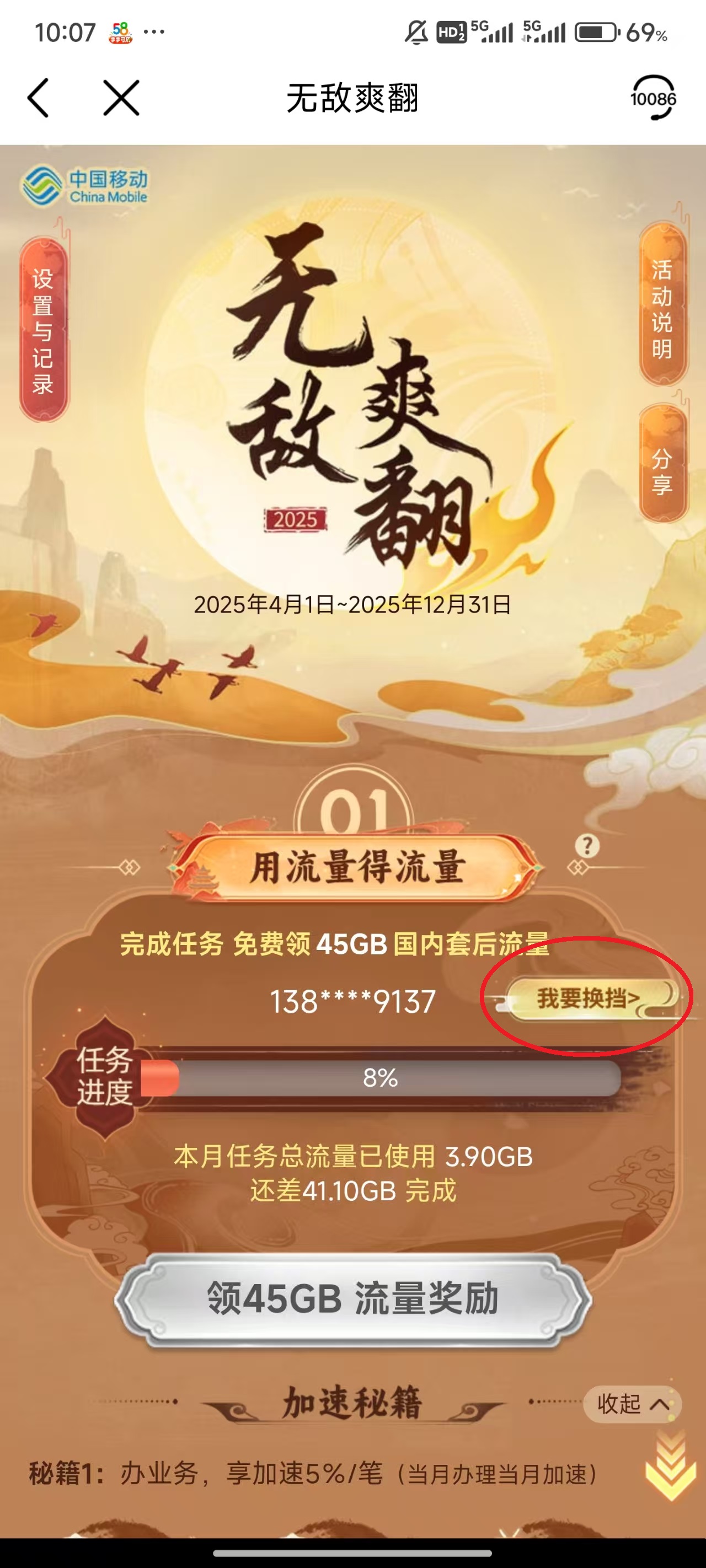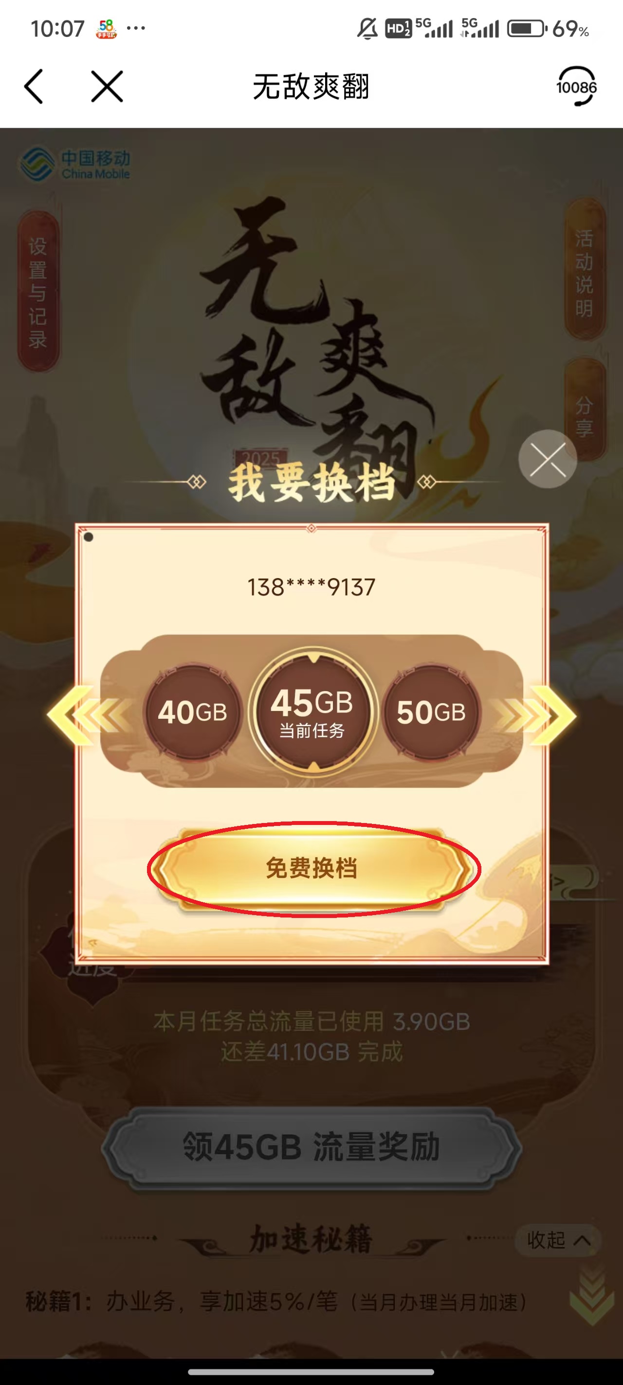 此时可以看到当前档位是45GB。如果想获得这45GB流量,就需要消耗45GB流量。若无法达到要求,可降低5GB;若觉得不够,也可提升档位,自由选择。接下来就是如何消耗足够的流量。