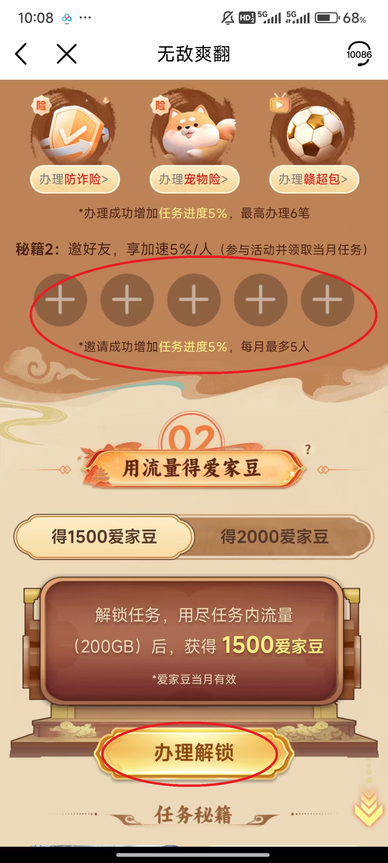 将页面向下滑动,可看到邀请好友,每邀请一个好友可增加5%进度,最多邀请五个好友;也可以选择点击办理最下方的中国移动云盘套餐,经实测是免费的。