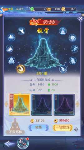 主角转生等级达到要求可开启炼体的修炼,不同炼体开启修炼的转生等级要求不同,消耗金币可对已开启的炼体进行修炼,修炼可为主角增加大量属性,修炼等级有上限,受限后需提升主角转生等级方可继续修炼。激活的炼体数量达到要求且都修炼到一定阶数,可进行不败金身的升阶操作,不败金身升阶为主角增加大量属性。