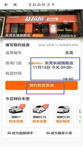 3、选择线下门店,预约到店时间,点击【预约到店咨询】,用户可在线下门店挑车进行租赁。