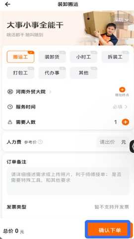 2、选择搬运工,添加地点以及时间,可输入订单注意事项等,点击【确认下单】即可。