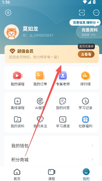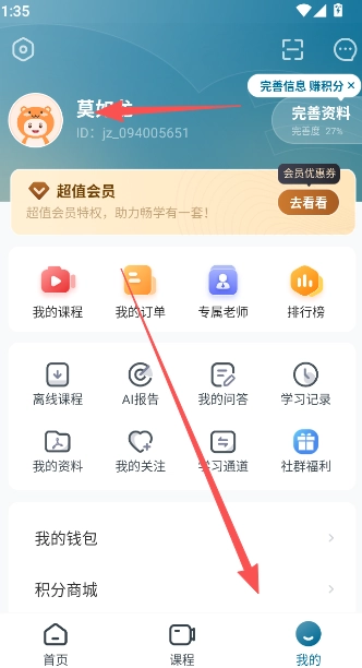 若遇到学习问题,或需查询专属老师、订单信息等,可在应用主页通过“我的”“个人中心”等入口。