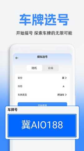 随机选号:通过一键随机选号功能,快速生成多个车牌号供参考,节省选择时间。