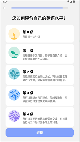 5、根据自己的实际情况,选择一个合适的口语水平等级,帮助Speak为你匹配适合的课程难度。