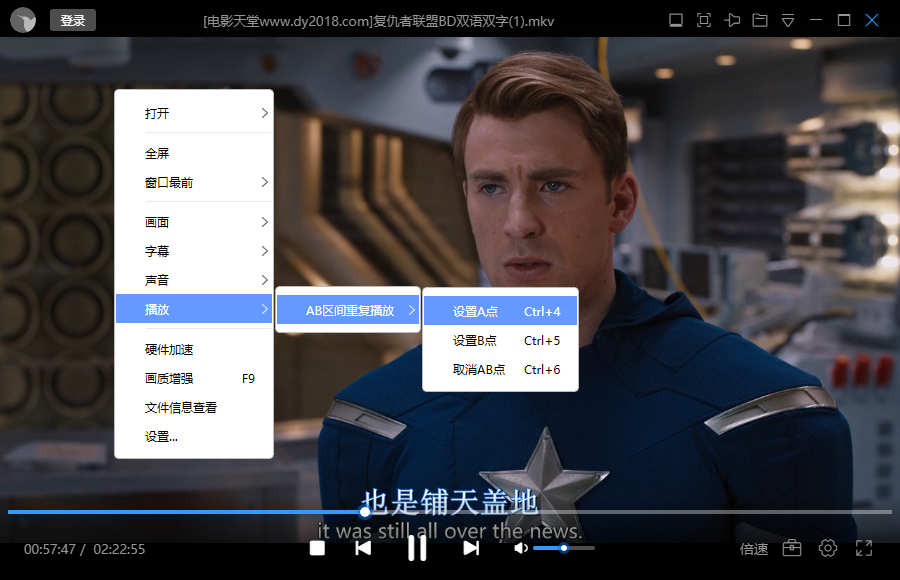 如果您不再需要AB区间重复播放功能,选择“取消AB点“,即为您取消AB区间视频片段的重复播放。