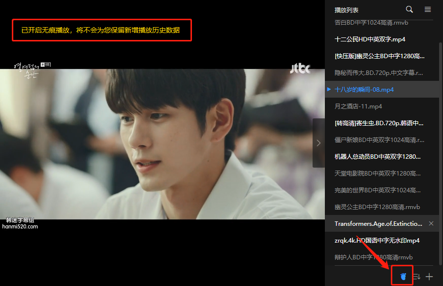 在播放列表区域的底部入口中,或在右键菜单中,选择无痕播放,将不会为您保留这期间的播放记录,保护您的播放隐私。
