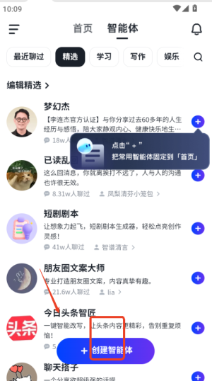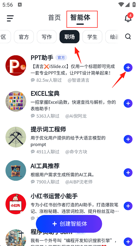 1、在智谱清言首页点击智能体-职场-添加PPT助手;