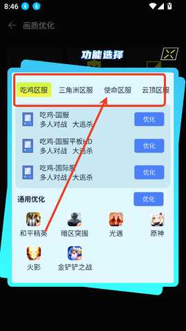 2. 画质优化:在首页,点击画质优化,选择需要的画质功能,并选择相应的游戏国服。点击优化进入设置。