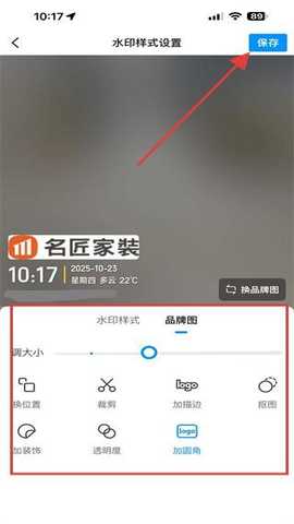 4.选择品牌图后,可调整水印样式如大小、位置、装饰等,调整完成后点击右上角保存按钮,完成品牌图修改。