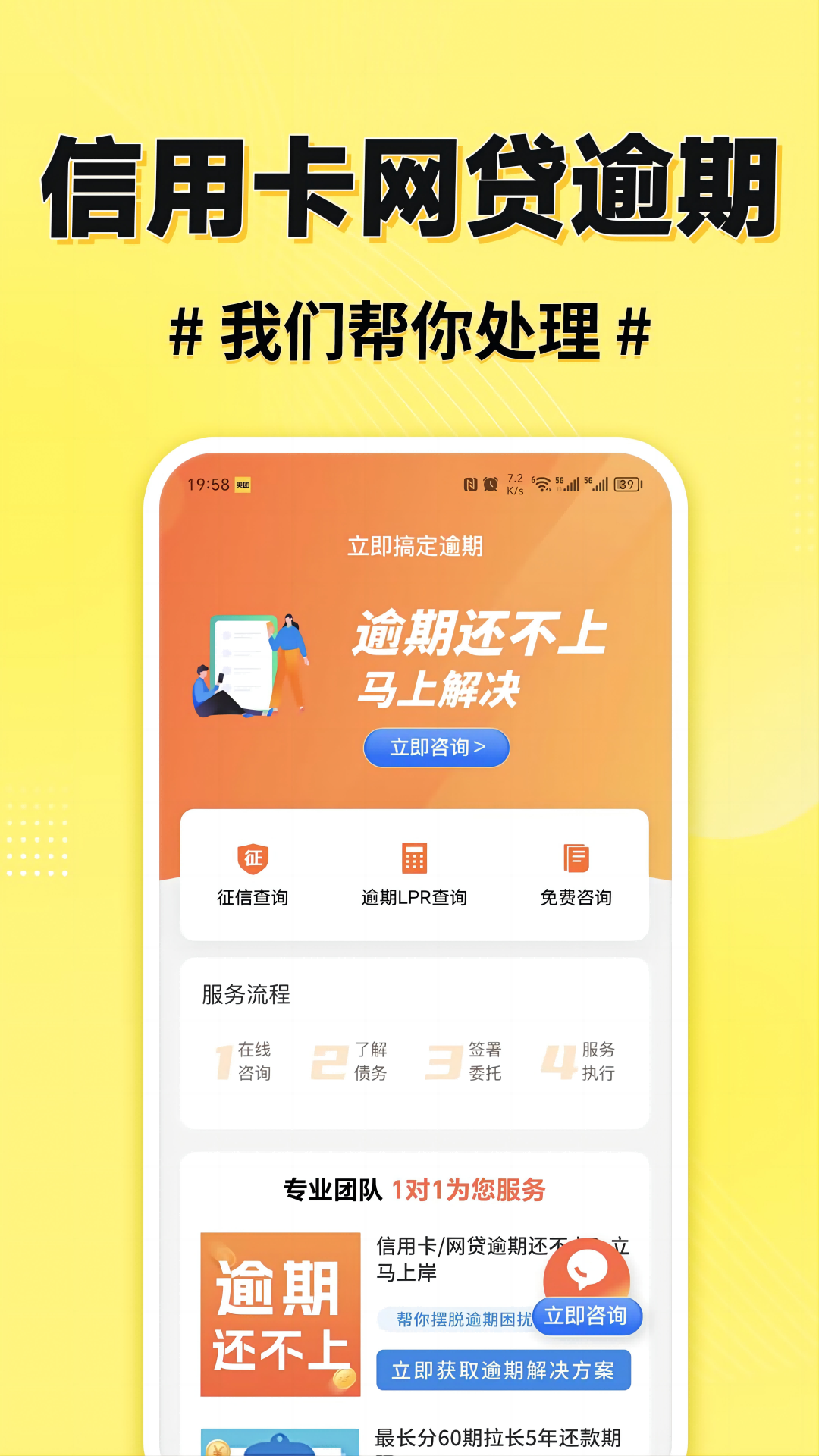 立即搞定逾期是一款专注于帮助用户解决信用卡和网贷债务逾期问题的工具。通过科学的债务规划、调解协商、维权服务以及心理辅导,帮助用户有效管理债务,减轻还款压力,恢复正常生活。无论是面对频繁的催款电话,还是复杂的还款计划,该工具都能提供专业指导,助您走出债务困境,重拾生活信心。