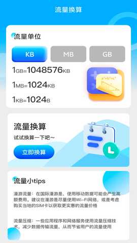 流量单位换算工具简便易用,支持快速转换不同的流量单位,帮助用户直观理解流量套餐的实际使用情况,避免因单位不清而造成的误解。
