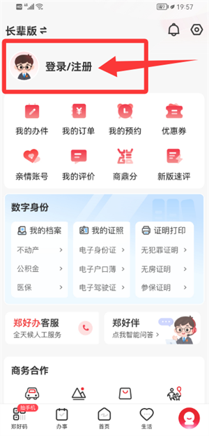 将界面切换至长辈版,点击“登录注册”选项,按提示完成账户验证。