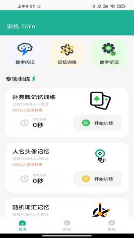 选择训练模式:在主界面上,选择想要进行的训练模式,如扑克牌训练、数字闪记等。