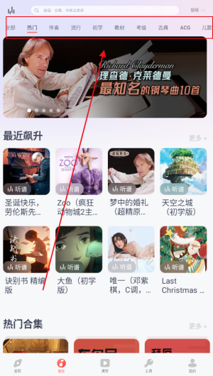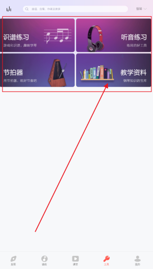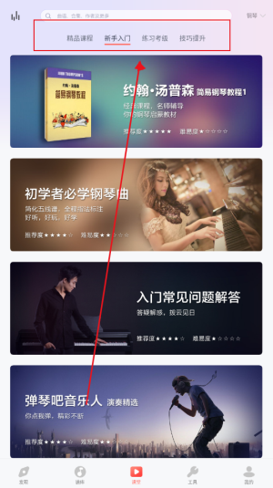 2、然后在首页浏览乐器分类,选择想要学习的项目,进入对应的工具界面查看分级教程并收藏乐谱。