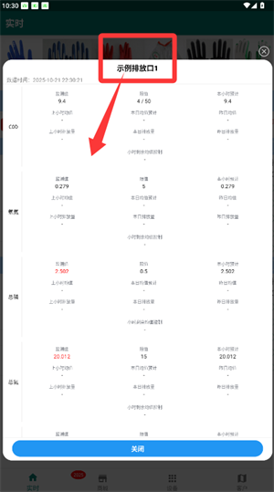 查看指标详情:点击具体排放口名称,即可查看COD、氨氮等指标的实时检测值及标准限值对比信息。