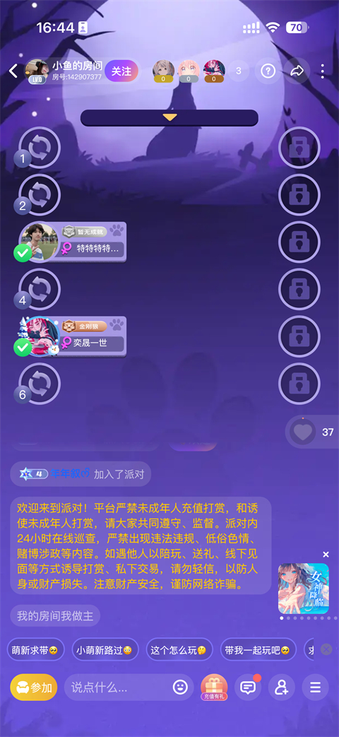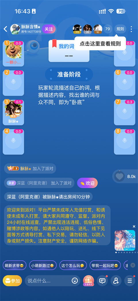 游戏房间创建:参与者可以自由创建或加入游戏房间,选择自己喜欢的游戏模式,随时开始一场新游戏。