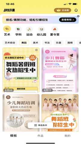 拼好课是一款专为教育行业量身定制的宣传海报制作工具,帮助教育机构和行业轻松制作各类宣传物料。可以快速创建海报、H5宣传页以及活动页面,满足多样化的宣传需求。其操作简单直观,支持自适应排版功能,丰富的互动工具使得活动数据可视化,极大提升了招生物料的设计效率,成为教育机构必不可少的宣传利器。