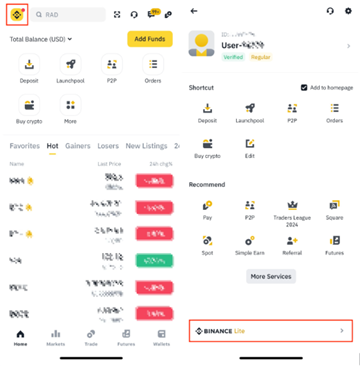点击首页左上角的币安图标,接着选择底部的“币安简易版”选项,即可切换到简洁模式界面。