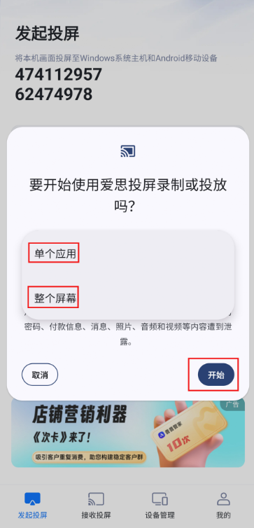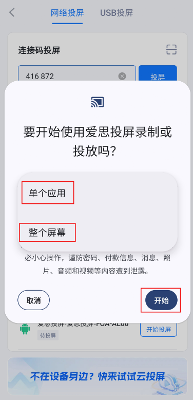 4、根据需要选择“单个应用”或“整个屏幕”,点击“开始”。投屏后,App界面中可以暂停/继续投屏、开关手机声音、开关麦克风、添加标注等。