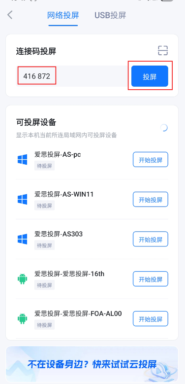 2、在“链接码投屏”中输入电脑上显示的投屏码,点击“投屏”。