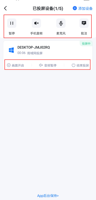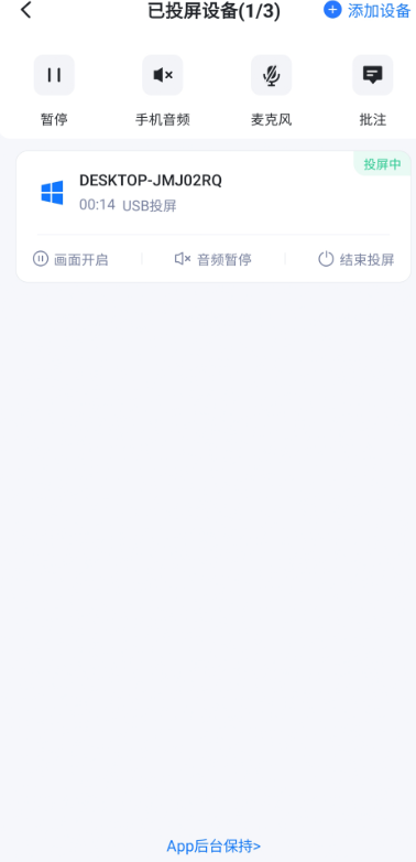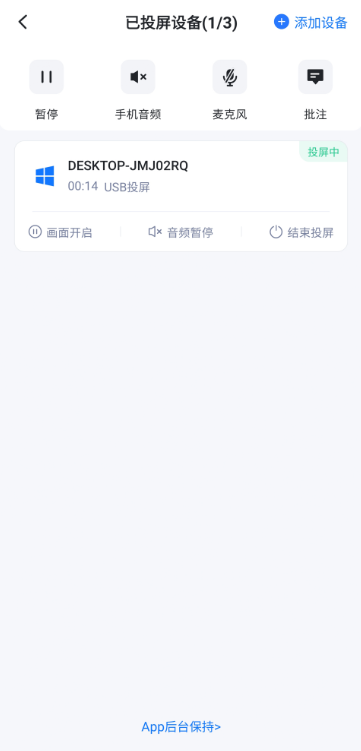 3、投屏后,App界面中可以暂停/继续投屏、开关手机声音、开关麦克风、添加标注等。