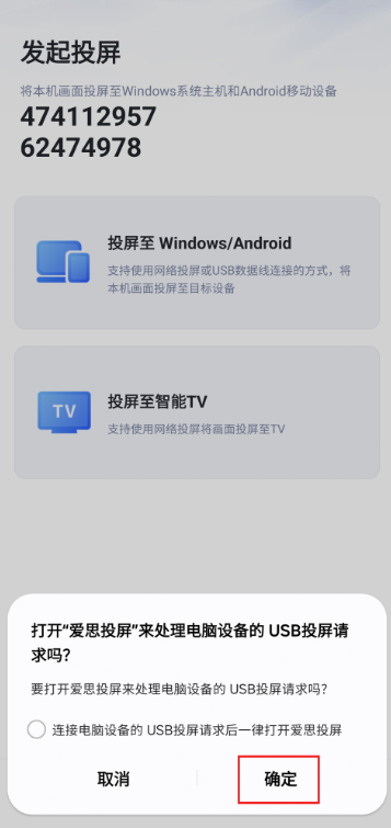 1、弹出投屏请求后点击“确定”。