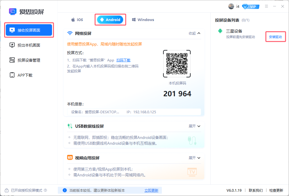 3、点击“安装驱动”,等待安装完成。如果安装成功后设备没有出现,可以插拔数据线重新连接,直到设备列表中出现“发起投屏”。
