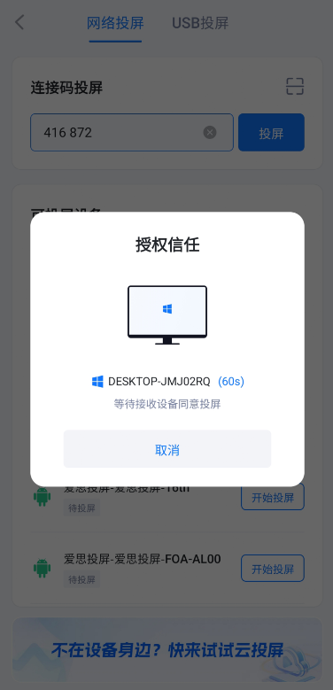 点击“发起投屏”后,在安卓设备上按以下步骤操作: