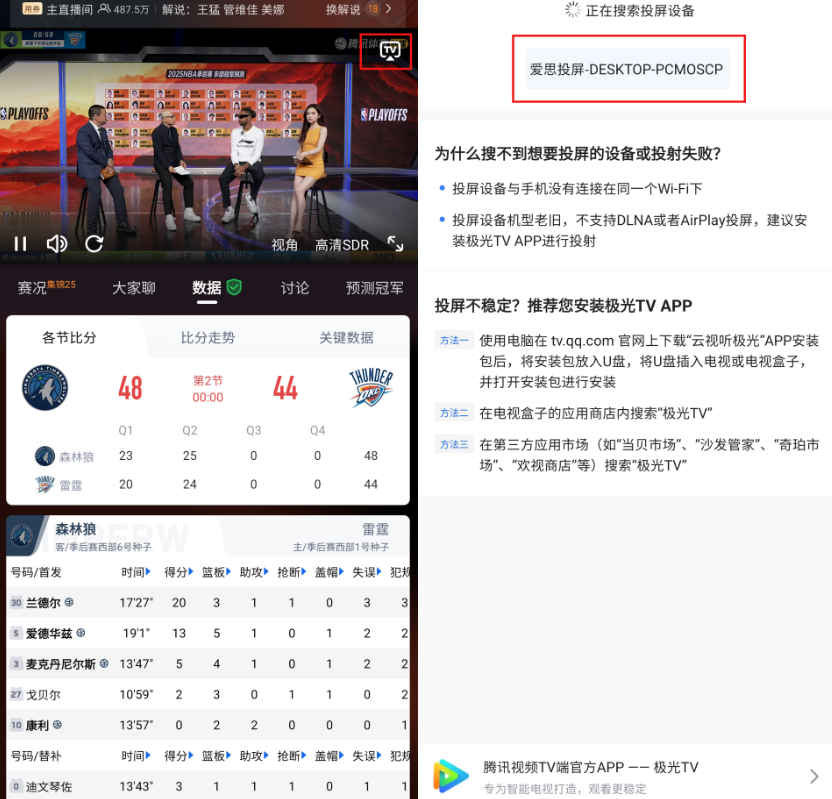 三、视频应用投屏时,安卓设备与Windows电脑需在同一局域网内,使用第三方音视频App投屏到Windows电脑。