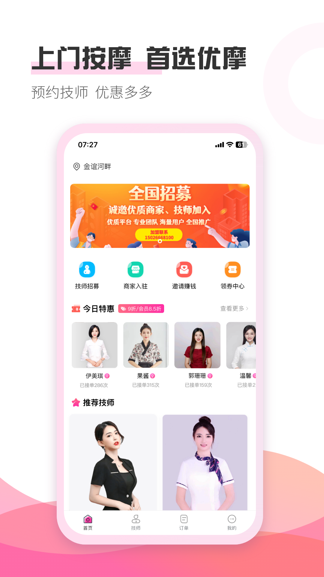 技师搜索:根据地理位置、服务类型和技师评分等条件,快速找到合适的按摩技师。