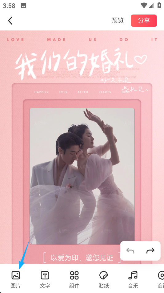 在婚礼请柬模块中,选择模板并进行个性化编辑,完成后可直接发送给亲友。