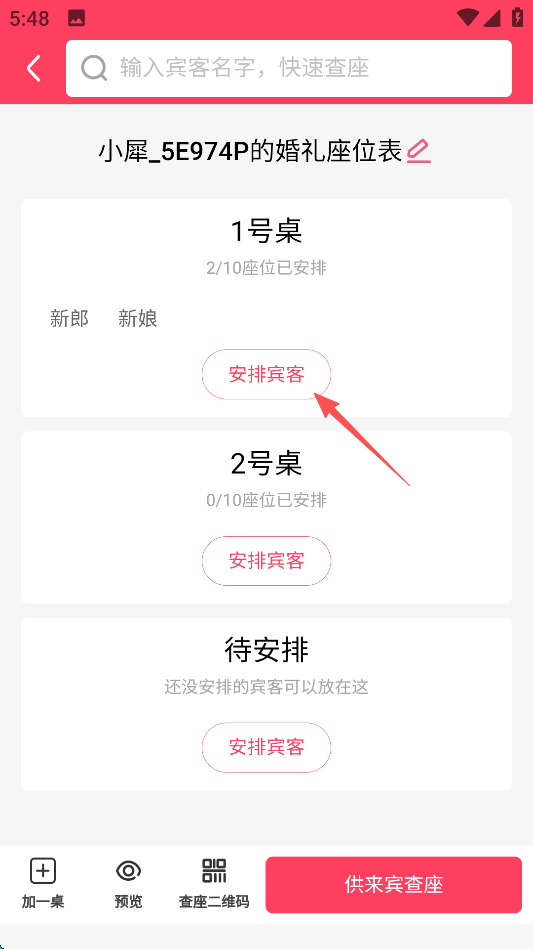 3、在相应的桌子安排人员,点击“安排宾客”。
