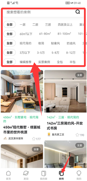 切换至「案例」栏目,通过筛选条件或关键词搜索定位目标装修风格。