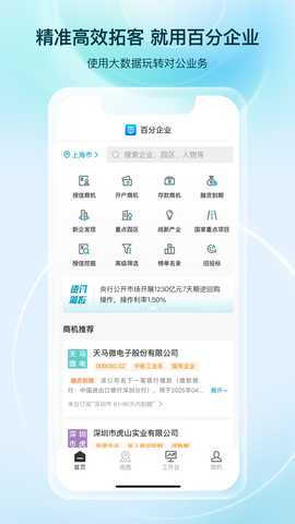 百分企业是一款为银行对公业务从业人员提供全面解决方案的智能化工具。结合了智能营销、风险控制、客户画像、信息资讯、分析工具和任务协作等多种功能,形成了一个高效的一站式工作环境。借助超过2亿条全球企业数据,利用大数据技术深入挖掘企业多维数据,帮助从业者在复杂的市场环境中找到潜在商机,提升工作效率,优化客户关系管理。