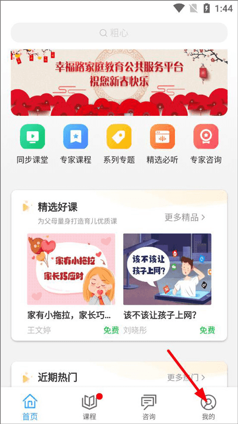 打开幸福路家庭教育平台App,进入首页后,用户可浏览同步课堂、专家课程、系列专题、近期热门、精选好课等板块内容。点击页面右下角的“我的”选项,进入个人中心页面;