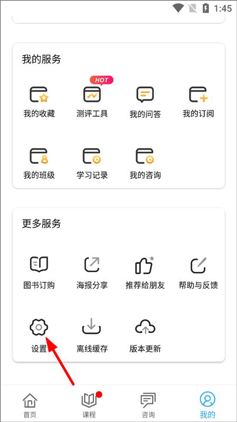 在个人中心页面,查看个人积分、累计学习时长、班级排名等信息。将页面向下滑动至底部,找到并点击“设置”选项;