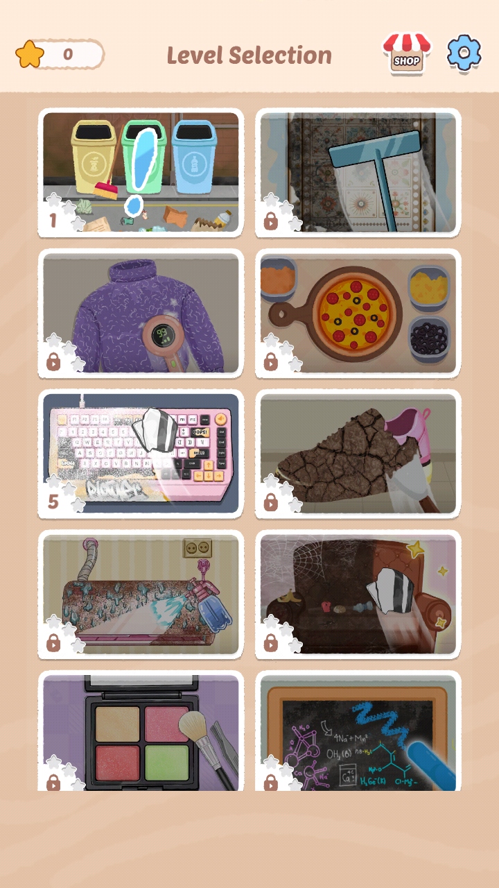 设置多样化的关卡挑战,可以在完成每一关的获得积分和奖励,解锁更高级的清洁工具。
