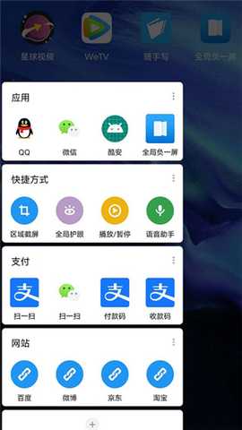 3.当你开启全局负一屏之后,手机桌面会出现一个区域很小的悬浮按钮,点击它即可打开全局负一屏的菜单信息栏,里面有应用、快捷方式、支付、网站4个栏目,支付目前只支持微信和支付宝的快捷支付方式,需要用到时,直接点击就能快速直达付款界面,而不用一步一步进入应用程序操作,非常方便。
