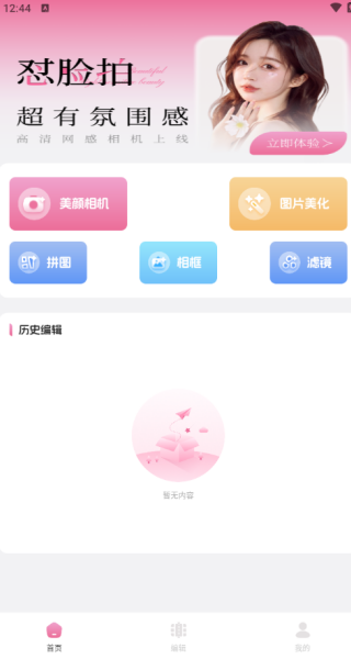 在首页中,看到多个功能选项,包括美颜相机、图片美化和拼图等,根据自己的需求选择相应的功能。