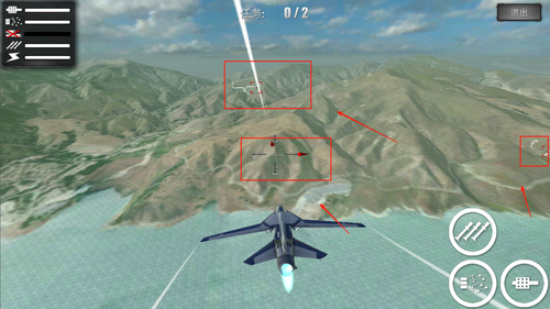 在战斗中,左侧的虚拟摇杆可以用来控制飞行方向和高度,而右侧则是加速、减速、瞄准、射击及导弹发射的按钮,滑动屏幕可以调整视角。