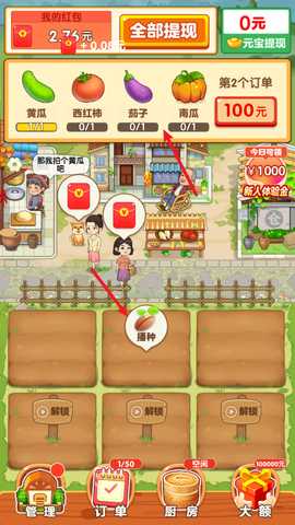 1、游戏中,我们可以在上方的任务栏中接取任务,并查看订单内容,点击下方空地即可种植。