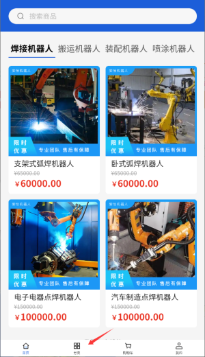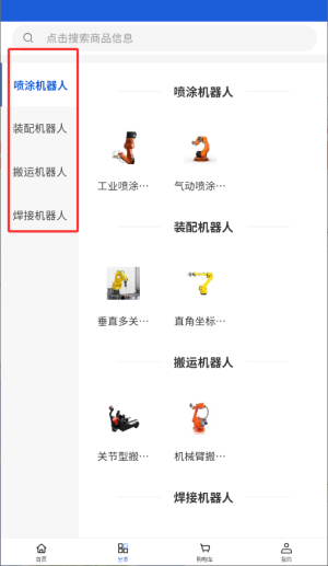 初次使用时,需在首页导航栏选择商品分类,浏览各类智能设备,找到所需的机器人类型。