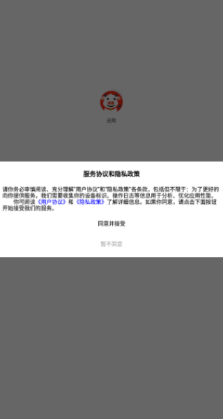 在设备上下载安装还购软件,打开后会出现服务协议页面,点击同意并接受即可进入主界面。