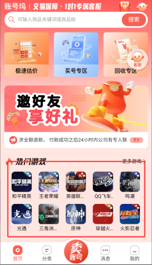 进入主界面后,选择游戏账号分类,浏览不同游戏的账号交易信息。